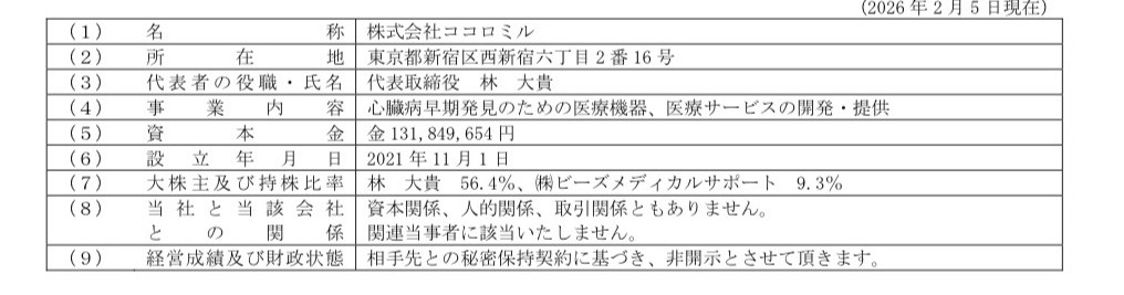 当社は、本日付の取締役会決議に基づき、「心臓(ココロ)をミル」をテーマに、心臓病を早期発見するための医療機器や医療サービスを提供するヘルスケア企業「株式会社ココロミル」(以下、「ココロミル社」といいます。)に資本参加し、資本業務提携契約を締結いたしましたので、お知らせいたします。