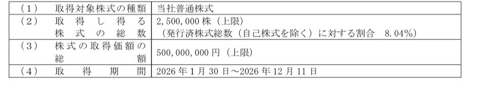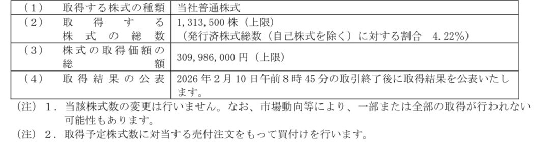 当社は、2025 年12 月12 日開催の取締役会において、会社法第165 条第3項の規定により読み替えて適用される同法第156 条の規定に基づき、自己株式取得に係る事項を決議いたしましたが、2026 年2 月9日開催の取締役会において、その一部につきまして具体的な取得方法を決議いたしましたので、下記の通りお知らせいたします。