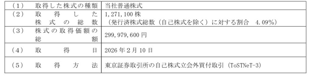 当社は、2026 年2月9日にお知らせした自己株式の取得について、本日、以下のとおり買付けを行いましたので、お知らせいたします。