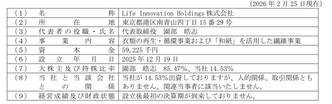 Life Innovation 社は、国内の大手アパレル会社のファッションデザイナーとしての経歴を持つ園部皓志氏が、クレサヴァ株式会社(本社:東京都港区南青山三丁目4 番7 号401 号室、以下、「クレサヴァ社」といいます。)の代表取締役として、廃棄衣類のリサイクル事業および日本の伝統素材である和紙を活用した新たな素材・事業分野に取り組んできた経験をもとに、環境性と文化的価値を両立した持続可能な事業モデルの構築を通じ、循環型社会の実現と事業のさらなる成長を見据えて、当社との共同事業により、さらに進化するため、2025 年12 月に設立した会社です。