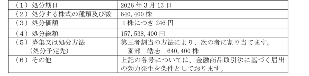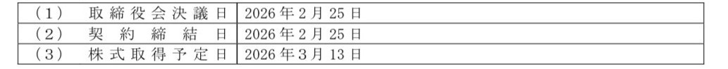 このため、2026 年2 月25 日開催の取締役会において、当社が取得予定であったLife Innovation 社株式の一部について、同社第三者割当増資の引受による取得から、園部氏保有株式の現物出資を受ける方法へ変更し、これに対する対価として当社自己株式を処分するスキームに変更することを決議いたしました。