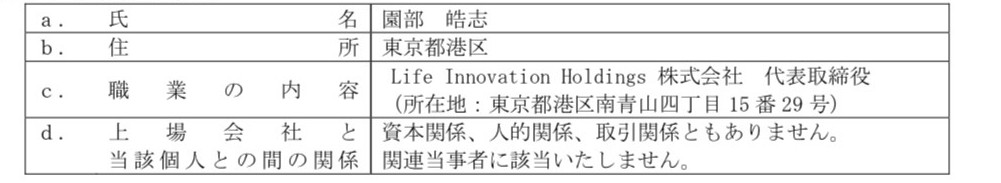 Life Innovation 社の事業成長は、園部氏の経営手腕および事業推進力に大きく依存することから、園部氏自身を当社株主とし、当社株価及び企業価値の向上が園部氏の経済的利益に直接反映されるスキームとすることで、当社と園部氏との利害を一致させ、中長期的な協業関係をより強固なものとすることを目的としております。