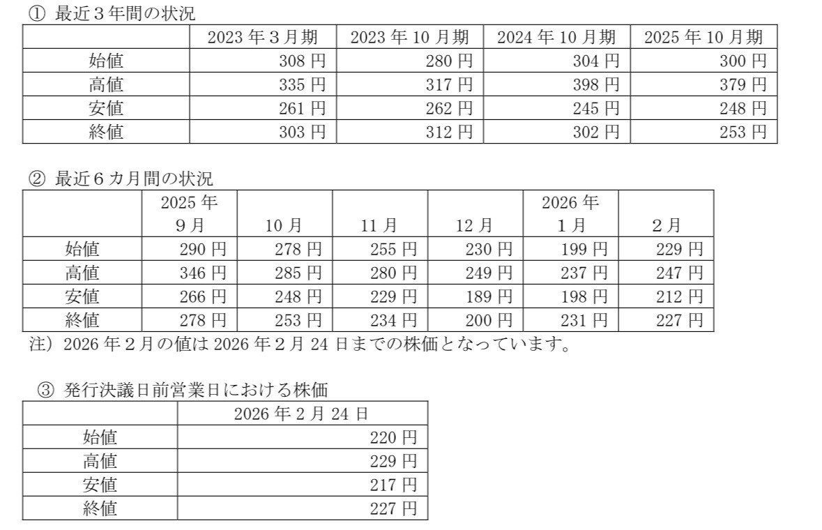 本自己株式処分の払込金額は、処分予定先との協議の結果、本自己株式処分に係る取締役会決議日の直前取引日(2026 年2 月24 日)までの6カ月間の株式会社東京証券取引所スタンダード市場における終値平均である245.83 円を基準とし、小数点以下を切り上げた246 円といたしました。