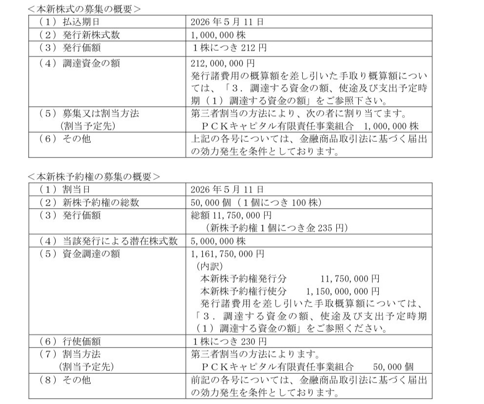 当社は、本日開催の取締役会において、割当予定先であるPCKキャピタル有限責任事業組合(以下、「PCKファンド」といいます。)を割当先とする第三者割当により発行される新株式(以下、「本新株式」といいます。)及び第18 回新株予約権(以下、「本新株予約権」といいます。)の発行(本新株式及び本新株予約権の発行を総称して「本第三者割当」といいます。)を行うことを決議いたしましたので、下記のとおり、お知らせいたします。