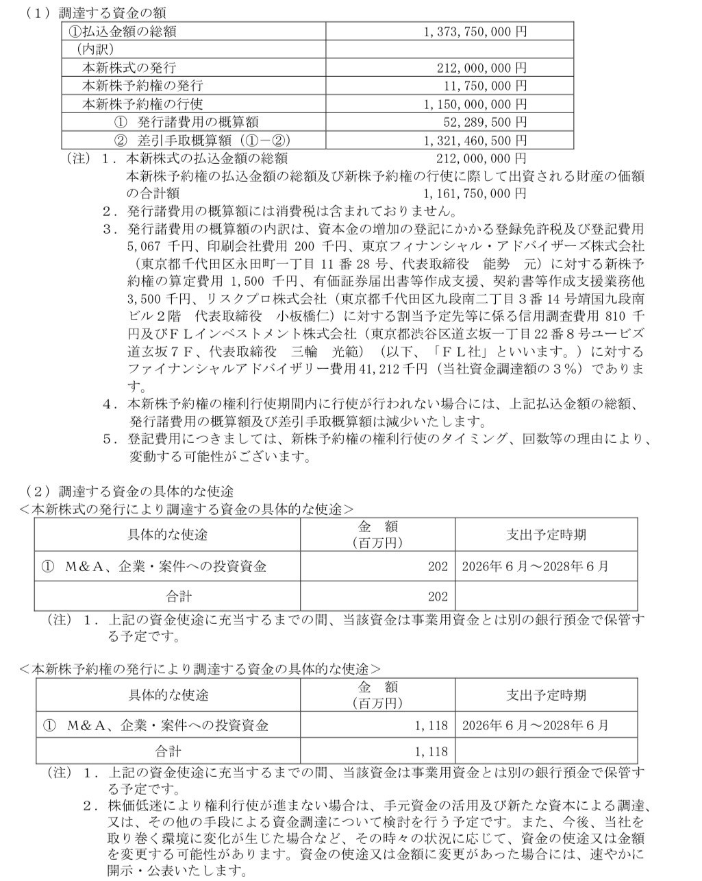 本M&Aの実行には概ね合計13 億円規模の資金を要する見込みであり、これは株式取得対価に加え、関連する諸費用(デューデリジェンス費用、アドバイザリー費用、統合作業に係る費用等)を含んだ試算に基づいております。