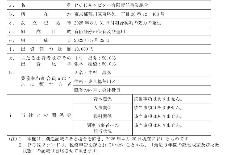 PCKファンドは、上場株式投資を主たる事業とする投資事業組合であり、株式市場に関する知見を有し、当社の資本政策に理解を示したため、当社の事業内容および経営方針に対する深い理解を頂ける、信頼性の高いパートナーと考えており、本第三者割当において適切な割当予定先であると判断しております。