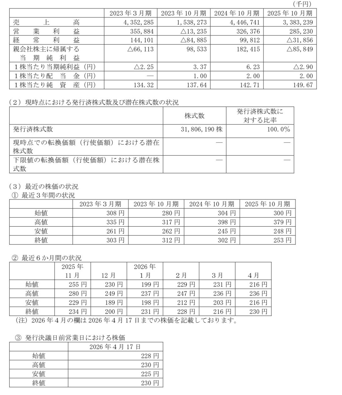 また、発行価額のディスカウント率を7.83%とした経緯としましては、2025 年10 月期の経営成績において31 百万円の経常損失を計上しており、依然として当社においては強固な利益基盤とはいえないことを勘案し、割当予定先からの8%程度のディスカウントの打診を受け、日証協指針に準拠する10%を超えない範囲で、相応の率をディスカウントすることはやむを得ないと判断し、発行価額について割当予定先のディスカウントに対する要望を受け入れた結果によるものとなります。