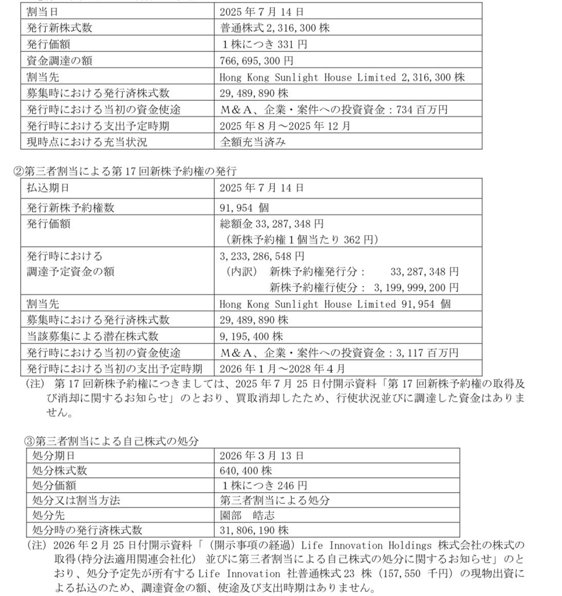 しかしながら、当社では、2025 年7月25 日付開示資料「第17 回新株予約権の取得及び消却に関するお知らせ」にてお知らせしましたとおり、新株式は発行したものの、第17 回新株予約権につきましては、買入消却することとしたため、新株式並びに第17 回新株予約権発行により見込んでいた資金調達3,999 百万円のうち、第17 回新株予約権の発行並びに権利行使で見込んでいた3,233 百万円の資金調達が未了となりました。